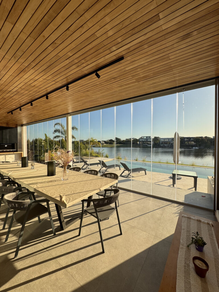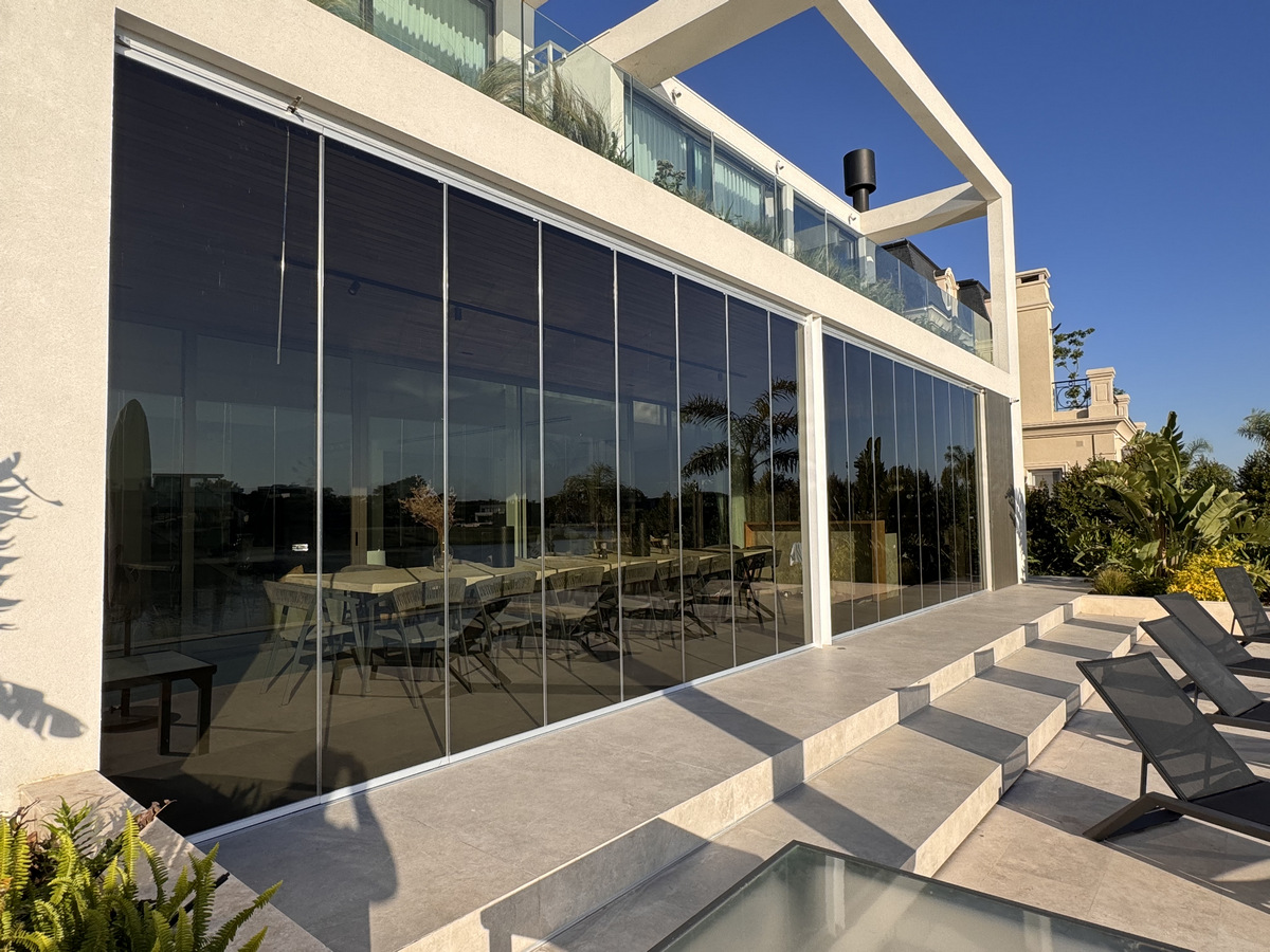 Claroflex Pivot es la versión más avanzada del sistema de cerramiento plegadizo sin perfiles verticales, desarrollado por la marca española Claroflex®. Su diseño patentado permite una apertura total del espacio con hojas de vidrio que se pliegan suavemente hacia los laterales, sin interferencias visuales ni estructurales.